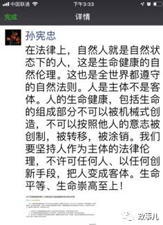全国人大宪法和法律委员会委员、中国社科院法学所研究员孙宪忠在微信朋友圈中发了这样一条消息:在法律上,自然人就是自然状态下的人,这是生命健康的自然伦理。这也是全世界都遵守的自然法则。人是主体不是客体。人的生命健康,包括生命的组成部分不可以被机械式创造,不可以按照他人的意志被创制,被转移,被涂销。我们要坚持人作为主体的法律伦理,不许可任何人、以任何创新手段,把人变成客体。生命平等、生命崇高至上!