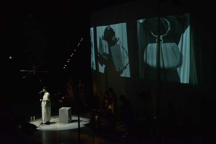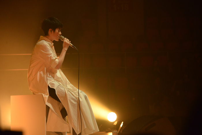 一盏由六只暖黄色灯泡组成的几何照明,悬挂在舞台的中央,除此以及背景的白色幕布之外,演唱会舞台并没有布施太多华丽装置。岑宁儿的声音特质,也因此更加得到凸显。