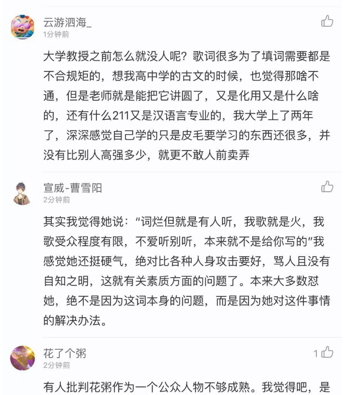 而近日,一位大学教师发微博评价这首歌歌词“狗屁不通”,并遭到曲作者和粉丝的一众围攻谩骂,更是加剧了网友的争议。