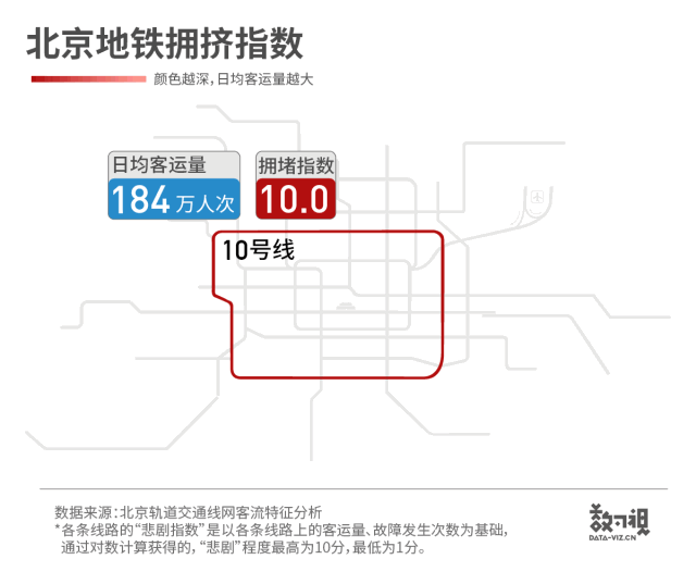 如果你每天依赖10号线出行,那么恭喜你成为了184万的分母之一,成功体验了北京地铁最高拥挤指数。在其他线路的乘客吐槽自己挤不上地铁的时候,你可以笑而不语,毕竟,10号线的乘客参与的是世界上规模最大之一的日行迁徙运动。