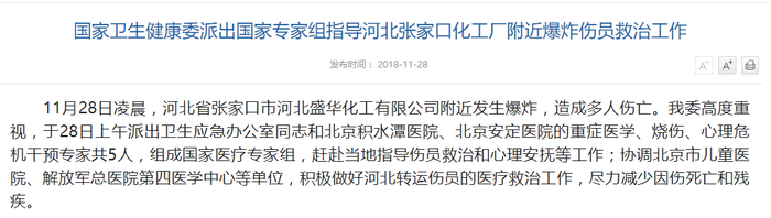 新京报快讯 据国家卫健委官网消息,11月28日凌晨,河北省张家口市河北盛华化工有限公司附近发生爆炸,造成多人伤亡。我委高度重视,于28日上午派出卫生应急办公室同志和北京积水潭医院、北京安定医院的重症医学、烧伤、心理危机干预专家共5人,组成国家医疗专家组,赶赴当地指导伤员救治和心理安抚等工作;协调北京市儿童医院、解放军总医院第四医学中心等单位,积极做好河北转运伤员的医疗救治工作,尽力减少因伤死亡和残疾。