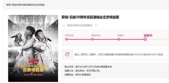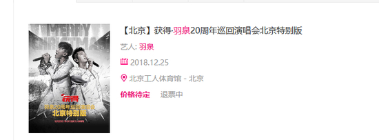 大麦网页面中,显示羽泉年底演唱会正在退票中。