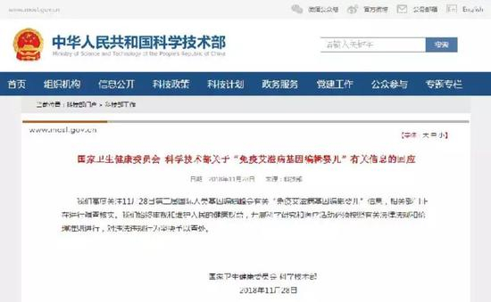 此前,在11月26日,贺建奎宣布一对名为露露和娜娜的“基因编辑婴儿”于11月在中国健康诞生,由于这对双胞胎的一个基因经过修改,她们出生后即能“天然抵抗艾滋病”,报道称,这是世界首例免疫艾滋病的“基因编辑婴儿”。