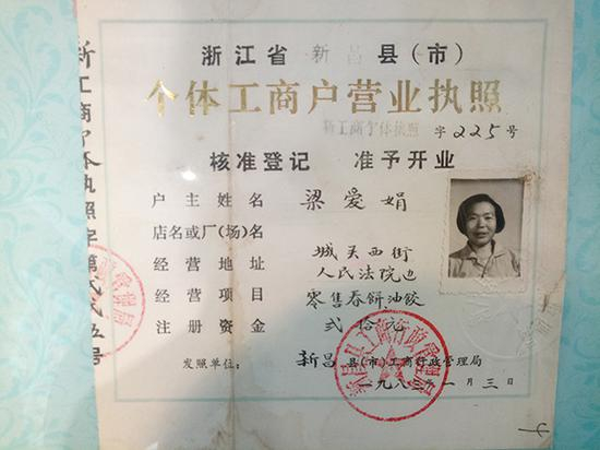 “奶奶早年卖春饼,后来开了个小杂货店。”梁爱娟的孙子裘宏钟说,“奶奶已去世十多年,没想到她这么早就领了个体户营业执照。”