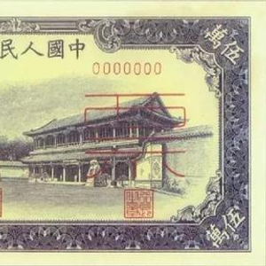 五万元新华门。北京印钞厂承印,印刷于1950年,发行于1953年,流通时间仅1年3个月,存世量不用多说,十分十分十分稀少。