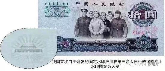 第三套人民币上,最大面额十元券上采用了固定水印作为防伪技术。1964年我国第一张固定水印钞票纸研制成功,“天安门放光芒”就是用在十元券上。