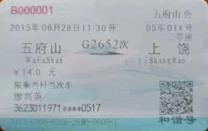 2015年6月28日,合福高铁建成通车当天,高铁五府山站首任站长廖兴英买下了车站通车后的第一张高铁票。