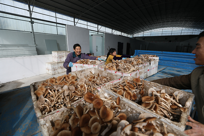 11月22日,四十八镇的一家菌菇厂房内,工人正在卸载刚采摘的菌菇。 新京报记者 王飞 摄