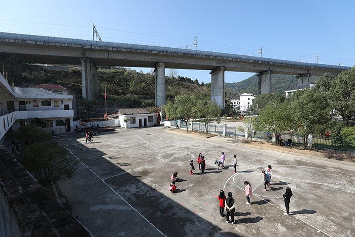 五府山高铁站高架桥下,有一所北山村小学。孩子们每天在操场上嬉戏时,就能看见桥上穿梭而过的白色列车。