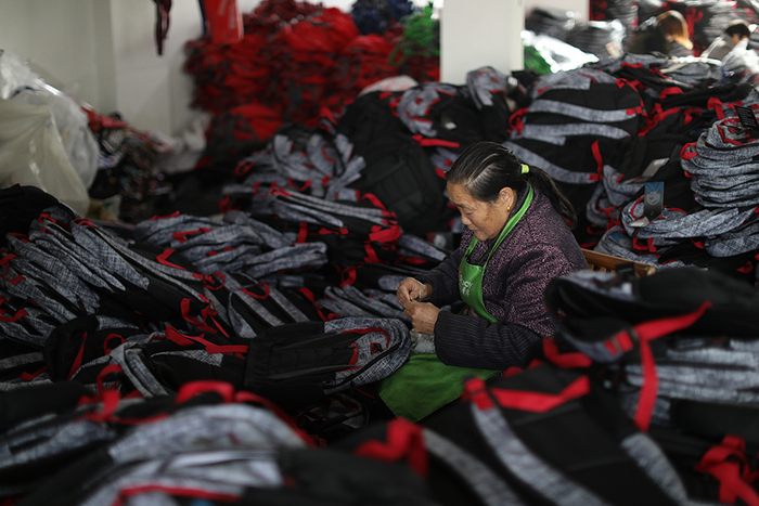 11月22日,四十八镇的一家箱包厂内工人正在穿吊牌。 新京报记者 王飞 摄