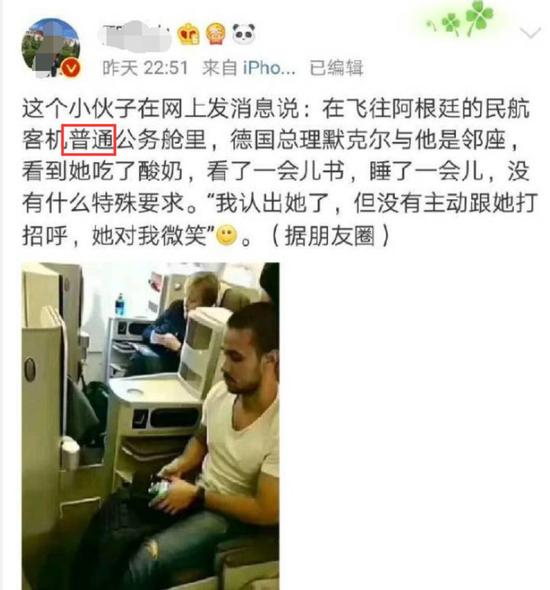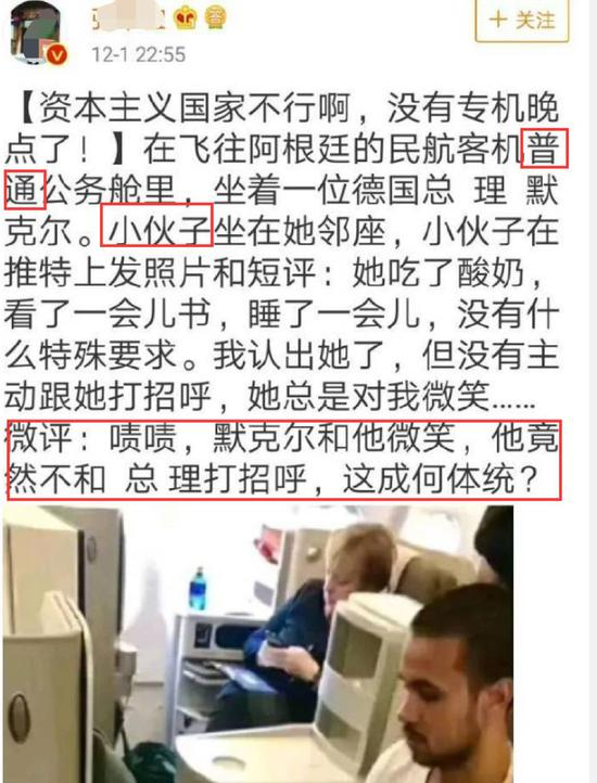 于是,原本是因专机故障和怕迟到才被迫改坐民航客机,而且坐的也是最顶级的商务舱的默克尔,就这样被中国网络上这些“大V”们“角度刁钻”地写成了一个“不坐专机坐民航”,而且坐“普通商务舱”,同时乘客不搭理她她还向人“陪笑”的“圣人”……