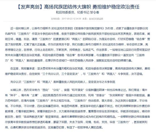 在这篇文章中他提到,过去的和田贫穷落后,上世纪90年代以来非法宗教活动活跃,宗教极端思想一度蔓延: