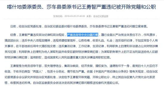 可能有小伙伴提出疑问,在其他省份的落马官员中,也存在一些扶贫工作中阳奉阴违的情况,为什么王勇智是“落实党中央治疆方略中阳奉阴违”?