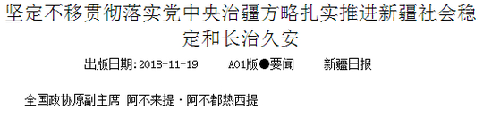 “前不久,我同60多位离退休老同志一道,赴和田地区进行了考察调研。”今年11月,《新疆日报》曾刊发了全国政协原副主席阿不来提•阿不都热西提撰写的一篇文章。