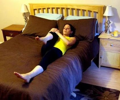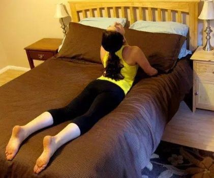 横躺在床中央,腿伸直。慢慢向后弯曲脊柱,头部放松,双手随着身体的移动向下延伸至地板,保持30秒均匀的呼吸。30秒后,弯曲膝盖,收回双手,躯干随着双手带回。