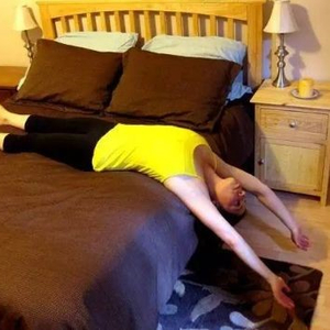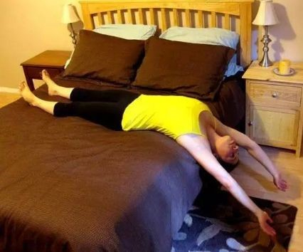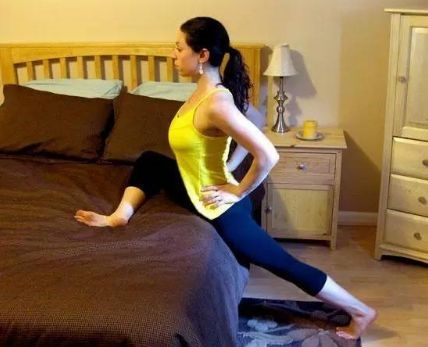 站在床前,将右脚放在床上,小腿尽量与大腿垂直,此时左腿尽可能向后伸直。根据自己的韧带,在极限处停留30秒。然后再做另一侧。