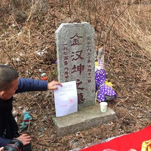 金哲宏的父亲葬在吉林省双河镇烈士陵园,山路难走,金哲宏拄着双拐,每走几步就要停下,儿子强行背起了他。一起来祭拜的金哲宏的战友,要跟金岩轮换着背。金哲宏摇头,嘴上连声说“不行”。