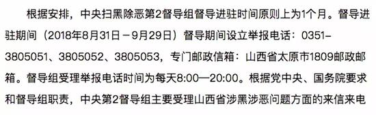 8月底至9月初,中央扫黑除恶专项斗争的9个督导组陆续进驻地方,其中,第2督导组进驻的省份便是山西,进驻时间为1个月。