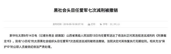 2018年2月13日,山西省公安厅通报,以“小四毛”任爱军为首的涉黑团伙被再次成功打掉,说“再次”,是因为任爱军曾两次入狱,七次被减刑: