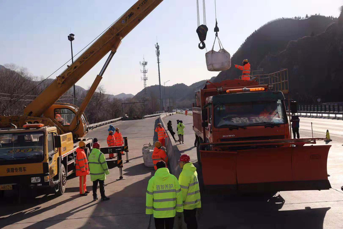今日上午,首发养护公司在京藏高速举行除雪演练。据了解,本次演练假设北京全市普降大雪,京藏山区段因短时降雪量大采取了封路措施。上午10点,在京藏高速的加料点,一台吊装设备正在向除雪车内补充融雪剂。随后,首发公司的“除雪抢险团队”还在京藏高速和进行高速上,分别演练了八达岭大桥长大桥除雪、事故车清拖与故障车维修、专职巡视与信息反馈、联合作业与内外部支援等多项作业。
