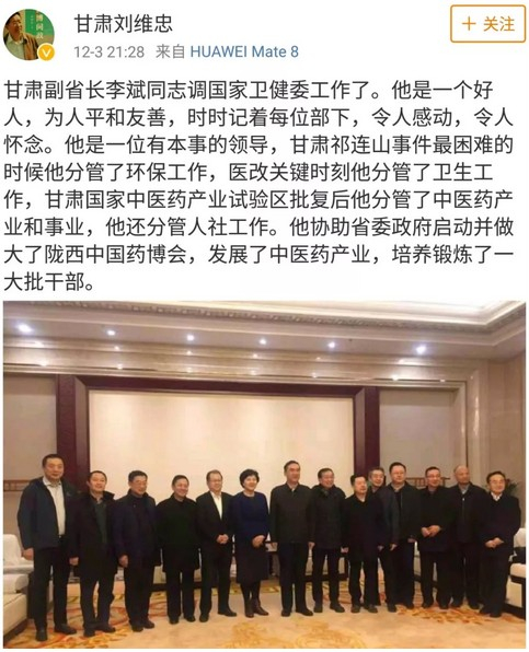 “甘肃副省长李斌同志调国家卫健委工作了。他是一个好人,为人平和友善,时时记着每位部下,令人感动,令人怀念。他是一位有本事的领导,甘肃祁连山事件最困难的时候他分管了环保工作,医改关键时刻他分管了卫生工作,甘肃国家中医药产业试验区批复后他分管了中医药产业和事业,他还分管人社工作。他协助省委政府启动并做大了陇西中国药博会,发展了中医药产业,培养锻炼了一大批干部。”刘维忠说。