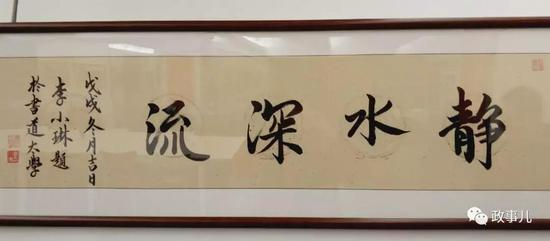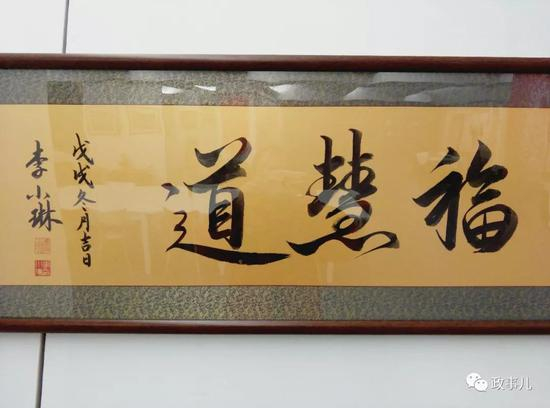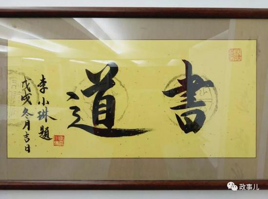 “政事儿”(微信ID:xjbzse)在展览现场看到,展厅内共展示了李小琳的3幅书法作品,分别为《书道》、《福慧道》、《静水深流》。落款为“李小琳题”,时间为“戊戌年冬月吉日”。