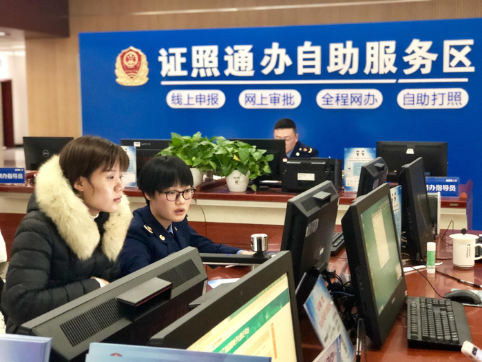 在现场工作人员的指导下,丁先生在办事大厅的“证照通办自助服务区”完成了营业执照申请。工作人员核查了他的信息后,服务区内的一台设备便打印出了新申报的营业执照。整个过程,仅用了三四十分钟。