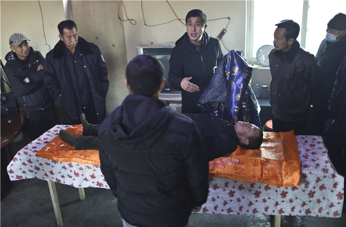 △ 辣椒夫妇、亮子和护工一起把穿戴好寿衣的逝者抬进纸棺中。