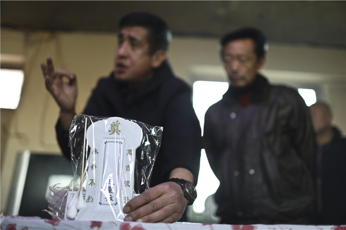 △ 重刑刑释人员创业基地,马宏军在给符合条件的狱友们进行殡葬师培训。寿衣、金银被褥、纸棺、祭奠亡人的烛台、长明灯,每个步骤都有说头和讲究。
