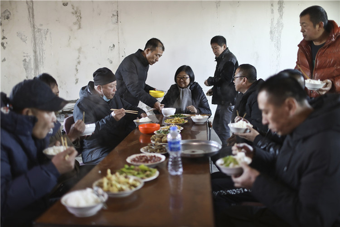 △ 重刑刑释人员创业基地,付广荣和来自各地的重刑刑释人员一起吃饭。