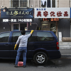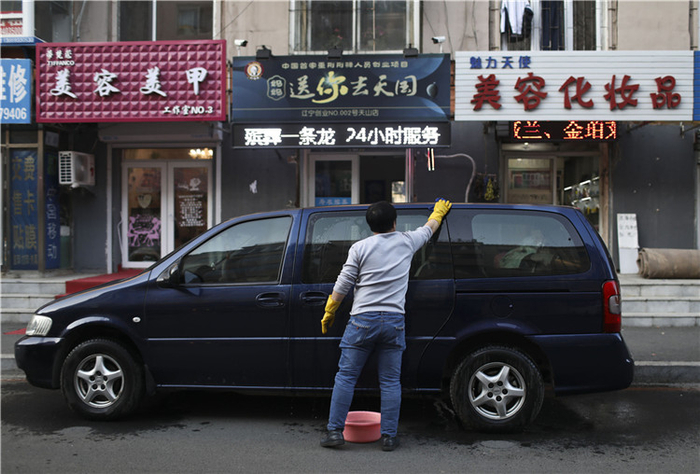 △ 12月1日,沈阳,辣椒在工作的殡葬店前擦洗自己的车,隔天要当出殡的头车。