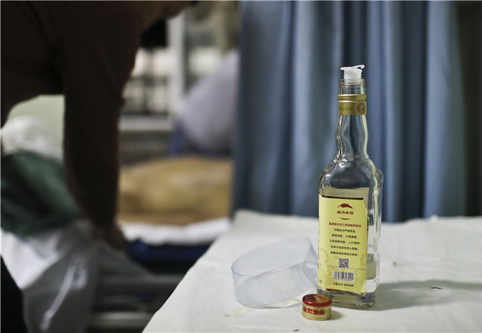浸润了高度白酒的白色毛巾从脸部开始擦拭,途经胸腹部直至脚部。每一处都要细细顾到。空气中满是烈酒的味道。
