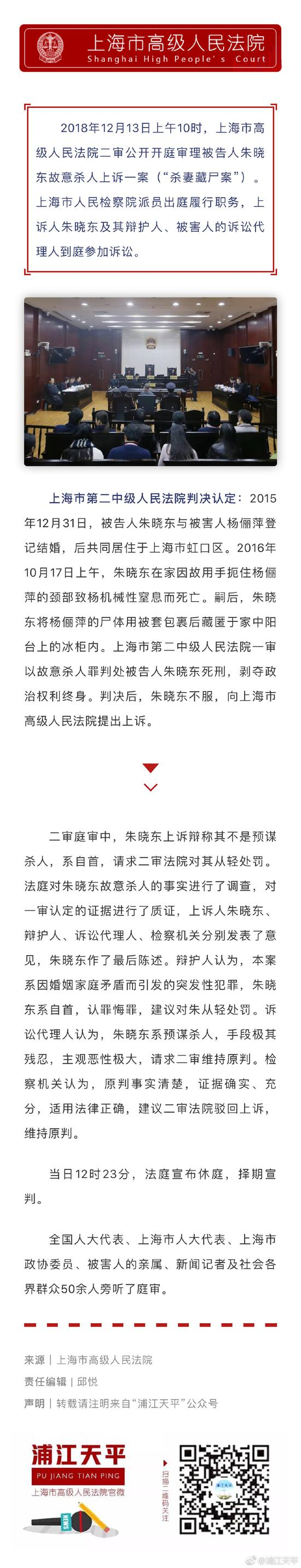 今日关注# #上海杀妻藏尸案二审#[上海高院二审公开开庭审理被告人朱晓东故意杀人上诉一案]2018年12月13日上午10时,上海高院二审公开开庭审理被告人朱晓东故意杀人上诉一案(“杀妻藏尸案”)。上海市人民检察院派员出庭履行职务,上诉人朱晓东及其辩护人、被害人的诉讼代理人到庭参加诉讼。