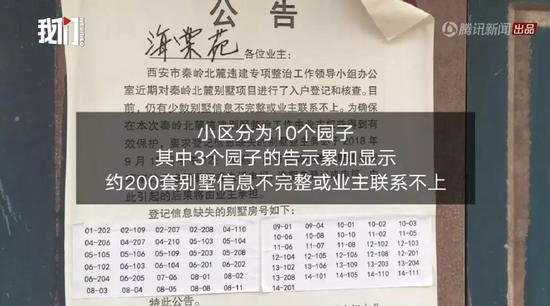 在秦岭山水小区内的公告栏上,贴有“寻找别墅业主”的告示。告示上每个数字编号代表一套未找到主人的别墅。秦岭山水小区分为10个园子,其中3个园子的告示累加显示 ,约200套别墅的业主信息曾缺失。