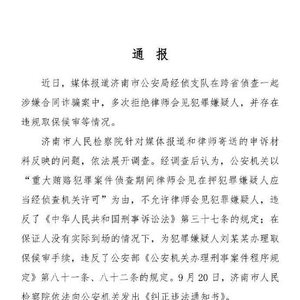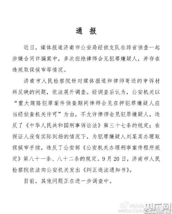 很快,济南市检察院对外通报称,经调查后认为,济南市公安机关在此案中存在违法违规行为,并向公安机关发出《纠正违法通知书》。相关违法行为得到纠正。