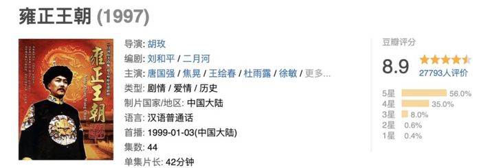 先后根据二月河小说改编的电视剧《雍正王朝》《康熙王朝》曾接连创下爆款纪录。中央电视台原台长杨伟光曾透露,用2600万元冒险买下的《雍正王朝》,(1999年)播出后不仅创下收视新纪录,收益也非常可观,仅首轮广告收益就超过了6000多万。而两年后播出的《康熙王朝》,收视率达到13%,全面超过《雍正王朝》。这两部作品也备受好评,豆瓣评分高达:8.9分和9.1分。