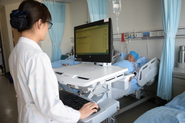 在每个楼层,还有移动护理车,推着这台“移动电脑”,护士在患者的床边就可以完成护理记录。