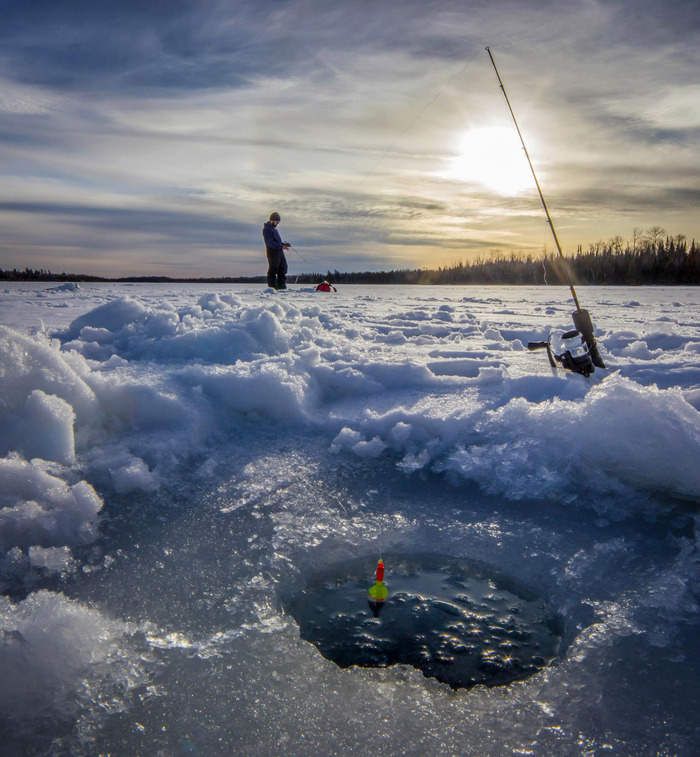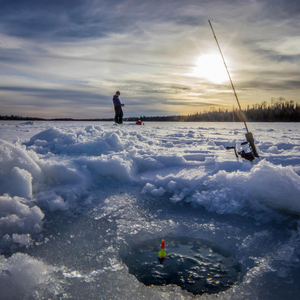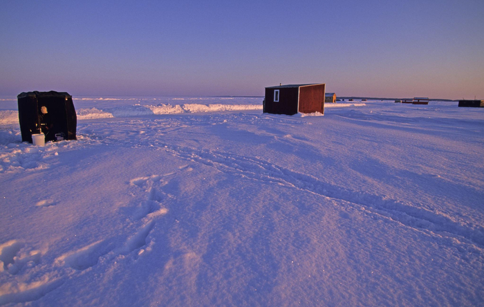 冰钓既可以在广阔的自然天地也可以在温暖的渔屋里。想象一下,坐在加热的鱼屋里,一边啜饮杜松子酒一边与同行钓鱼伙伴打牌。在这里,最艰难的决定是将鱼饵放在夹具上还是裸钩上;或者你不用做出选择,因为在明州一个钓鱼者可以合法地将一条鱼线同时放入两个洞中,一个洞一个钓法,问题解决了。