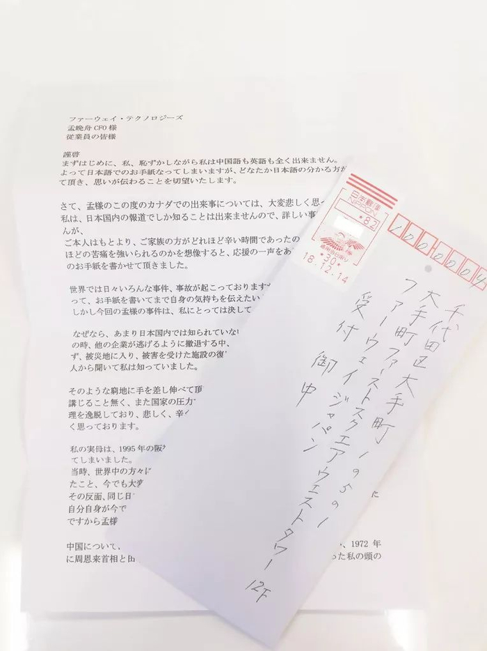 经长安街知事(微信ID:Capitalnews)求证,这封信是12月17日华为公司日本代表处所收,寄信人是一名普通的东京市民。为保护对方个人隐私,华为方面没有透露寄信人的真实姓名。
