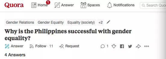 在问答论坛Quora上,针对为何菲律宾成功实现性别平等的问题,有人回答称,菲律宾实际上没有实现性别平等,只是菲律宾人比较保守,其尊重女性的文化传统与性别平等的现代理念相容。