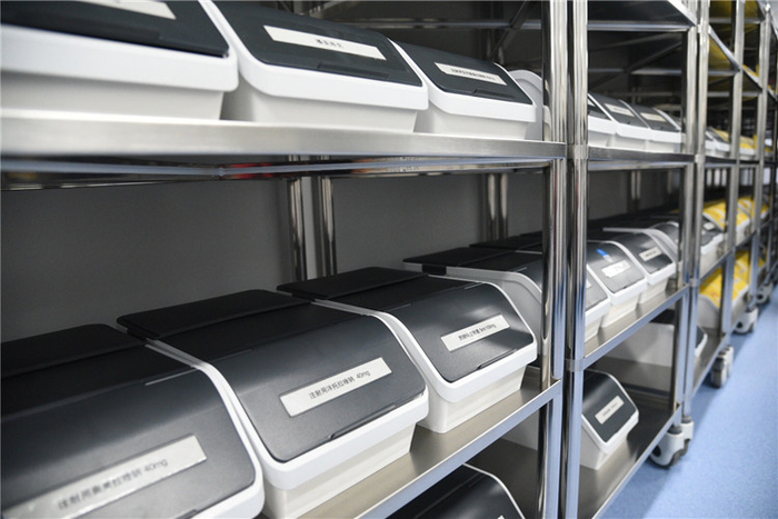 医院静脉用药调配中心里整齐放置的药品。新京报记者戴轩 实习生湛超越 摄影报道