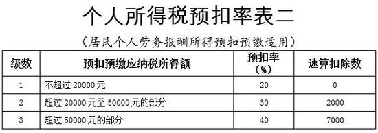 应纳税所得额:劳务报酬所得、稿酬所得、特许权使用费所得,以每次收入额为预扣预缴应纳税所得额,计算应预扣预缴税额。劳务报酬所得适用个人所得税预扣率表二(见附件),稿酬所得、特许权使用费所得适用百分之二十的比例预扣率。