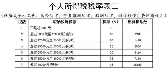 非居民个人的工资、薪金所得,以每月收入额减除费用五千元后的余额为应纳税所得额;劳务报酬所得、稿酬所得、特许权使用费所得,以每次收入额为应纳税所得额,适用个人所得税税率表三(见附件)计算应纳税额。劳务报酬所得、稿酬所得、特许权使用费所得以收入减除百分之二十的费用后的余额为收入额;其中,稿酬所得的收入额减按百分之七十计算。