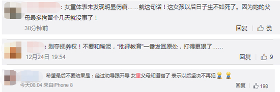 很多网友担心,虽然其父母行为恶劣,但由于“女童体表未发现明显伤痕”,可能使二人逃脱较重的处罚,而一旦他们回到家,小女孩或将再陷危机中。