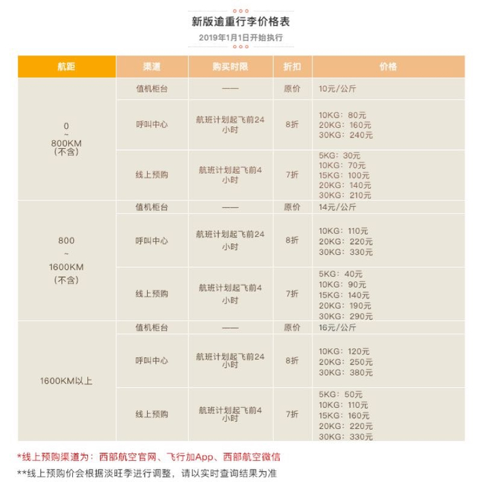 西部航空新版逾重行李价格表。图片来源/西部航空官方微信截图