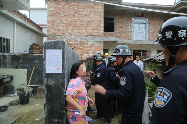 看到不期而至的执行干警,朱某华的妻子陈某情绪激动。警戒线布设后,陈某对主办法官宣读的执行内容与纪律毫不理会,拒不离开执行现场,厉声指责法院“黑心裁判”“野蛮执法”。正当法官耐心劝导时,陈某的母亲与家婆闻风而来,也加入了“战场”。三人站到墙根下,挽手护墙,推搡干警。面对阻挠行为,法警亮出了手铐,迅速将三人强制带离现场。