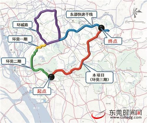 项目起点接环莞二期跨常虎高速主线桥,途经虎门、大岭山、松山湖、大朗、东坑、常平、横沥、企石等9个镇街(园区),相继与广深高铁、广深铁路、莞穗城际、莞深高速、常虎高速交会,终点接东部快速路。线路长约43.6公里,城市快速路标准,主路双向6车道,设计时速80公里。其中,龙大高速至莞深高速段工程,起于龙大高速,终于莞深高速,途经大岭山镇、大朗镇、松山湖园区,与常虎高速交会,线路长约9.4km,计划2022年全面建成通车。