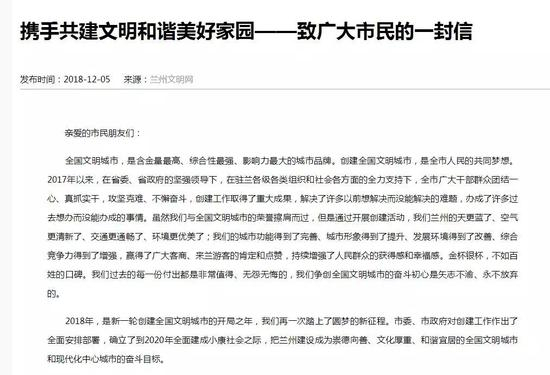 12月5日,甘肃方面发了一封公开信——《携手共建文明和谐美好家园——致广大市民的一封信》,再次呼吁市民积极投入到创建全国文明城市的活动中去。