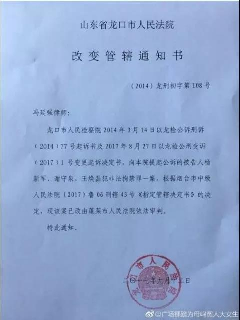 ▲ 去年9月,该案实现异地管辖,迎来转机,改由蓬莱市人民法院审判。图片来源:李宁微博。