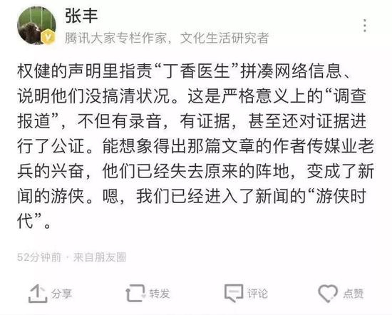 腾讯大家专栏作家张丰在评论丁香医生一文时说道:“权健的声明里指责丁香医生拼凑网络信息,说明他们没搞清状况。这是严格意义上的‘调查报道’,不但有录音,有证据,甚至还对证据进行了公证……”↓↓